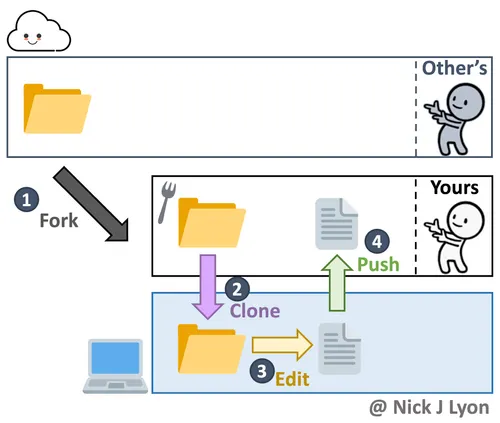 A partir desse fork pessoal, o desenvolvedor clona o código para sua máquina local, faz suas alterações em uma branch de desenvolvimento, e envia esses commits de volta para o seu próprio fork. O código original, chamado de upstream, permanece intocado durante todo esse processo.